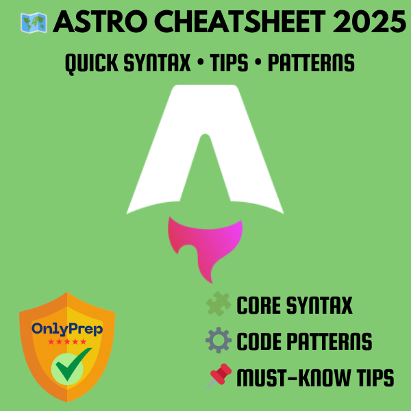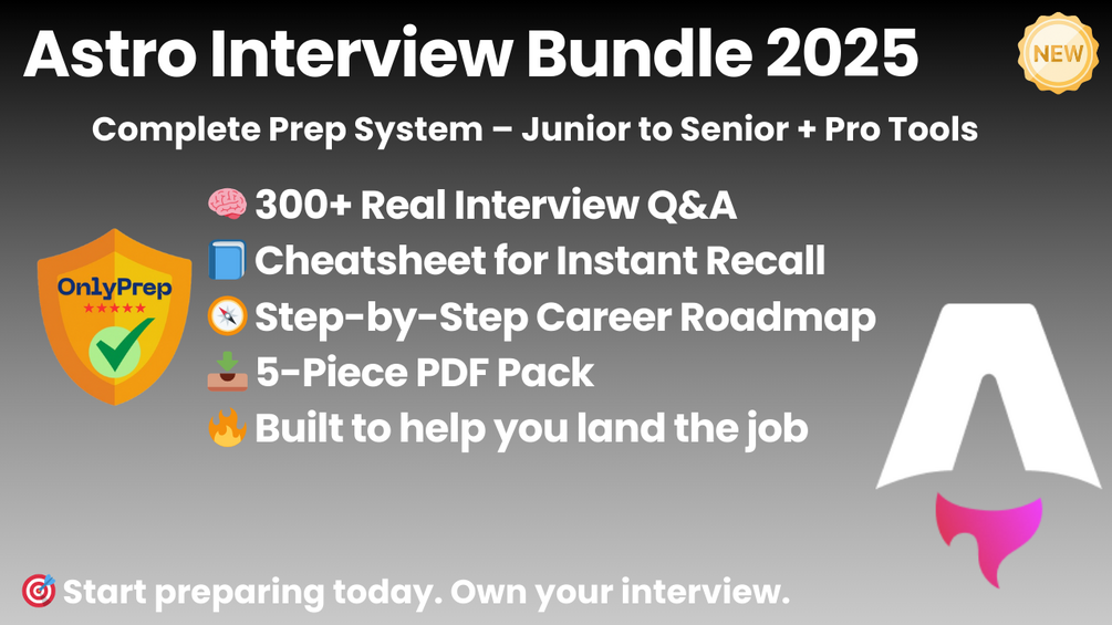 This is the complete Astro interview prep system. Five carefully crafted resources — created by modern front-end developers and performance-focused mentors — based on real-world interview formats and current hiring expectations. Built to help you review key Astro concepts, practice real questions, and walk into your next interview with confidence.