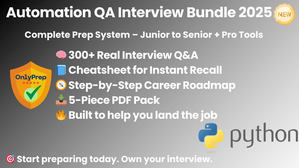 This is the complete Automation QA (Python) interview prep system. Five carefully crafted resources — created by experienced Python-based SDETs and QA mentors — based on real-world interview formats and current industry expectations.
