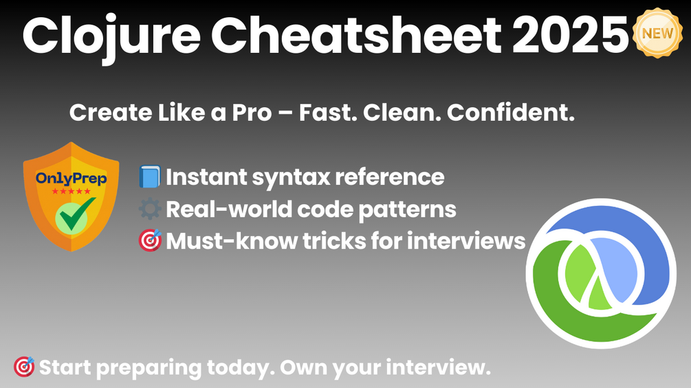 This cheatsheet is your go-to quick reference for Clojure development, covering core language idioms, functional design patterns, and real-world workflows for building robust and expressive applications. Whether you're prepping for an interview, building backend services, or sharpening your REPL game — this sheet is built to save time and boost your confidence.