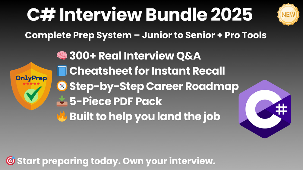 This is the complete C# interview prep system. Five powerful resources — crafted by experienced .NET engineers, based on real hiring patterns, and built to help you write cleaner code, debug faster, and land your next C#/.NET role with confidence.