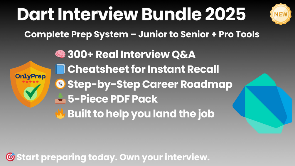 This is the complete Dart interview prep system. Five powerful resources — crafted by experienced Dart and Flutter engineers, based on real hiring patterns, and built to help you write cleaner code, debug faster, and land your next Dart role with confidence.