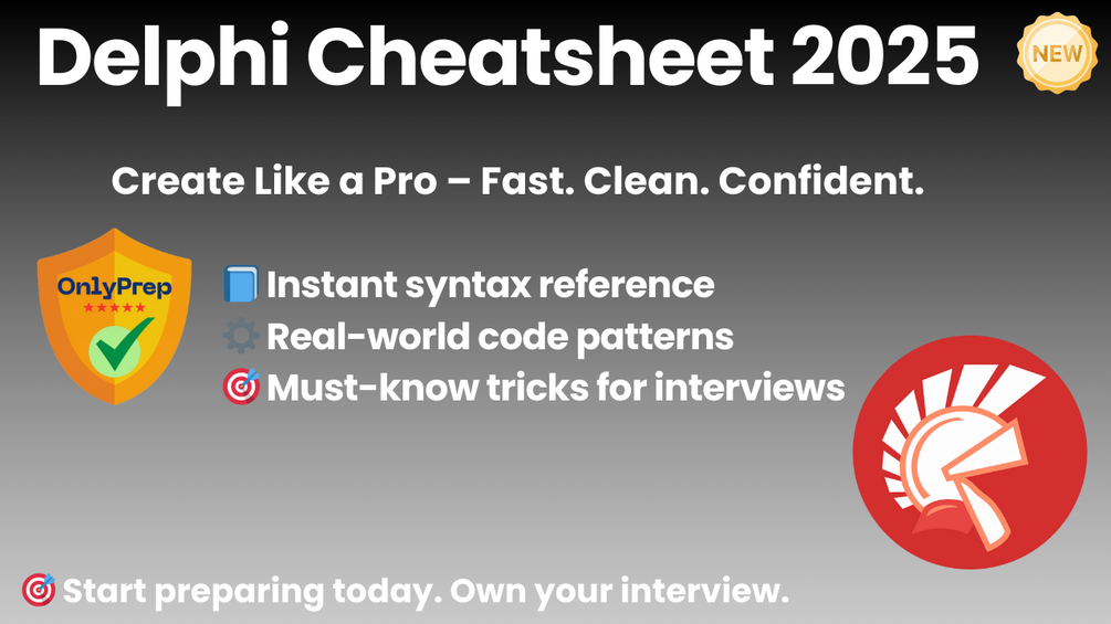 This cheatsheet is your go-to quick reference for Delphi development, covering essential syntax, GUI components, and database workflows. Whether you're prepping for a desktop dev role, maintaining legacy systems, or building modern cross-platform apps — this sheet is built to save time and boost your confidence.