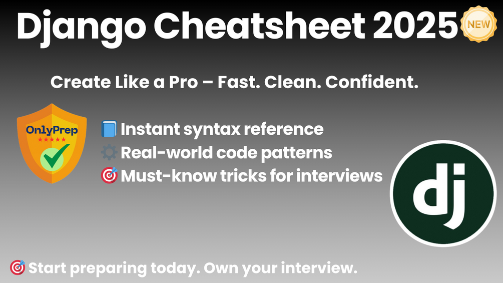 This cheatsheet is your go-to quick reference for Django development, covering essential syntax, model/view patterns, and data workflows. Whether you're prepping for a backend dev role, building APIs, or shipping full-stack features — this sheet is built to save time and boost your confidence.