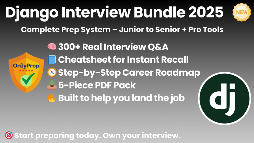 This is the complete Django interview prep system. Five powerful resources — crafted by experienced Django developers, backend engineers, and technical interviewers, based on real hiring patterns in tech companies, startups, and SaaS platforms. Built to help you write robust code, solve backend challenges, and land your next Django role with confidence.