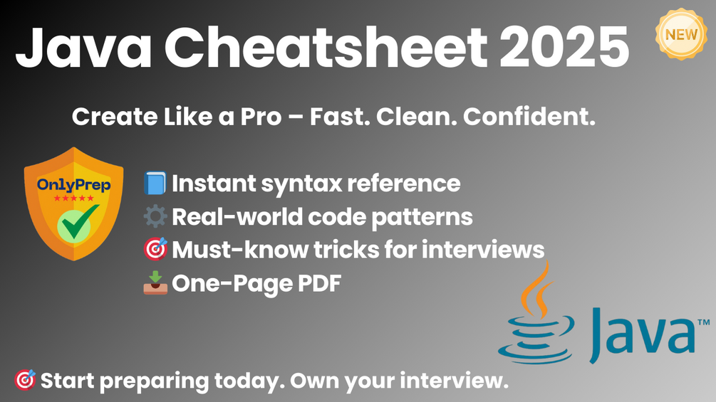 This cheatsheet is your go-to quick reference for core Java syntax, essential patterns, and interview-ready tips. Whether you’re prepping for a technical screen, building your next backend project, or leveling up for a new role — this sheet is built to save time and sharpen your edge.