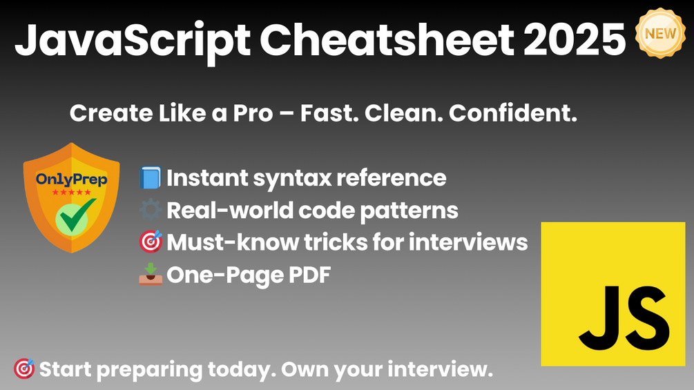 This cheatsheet is your go-to quick reference for modern JavaScript (ES6+) syntax, essential patterns, and interview-ready tips. Whether you’re prepping for a frontend screen, building your next project, or sharpening your JS fundamentals — this sheet is built to save time and boost your confidence.