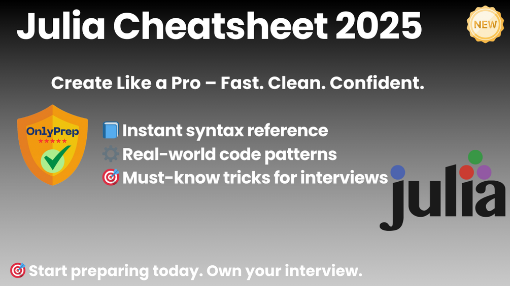 This cheatsheet is your go-to quick reference for Julia development, covering performance patterns, type tricks, core libraries, and real-world workflows. Whether you're prepping for a technical interview, building scientific models, or refining your data pipelines — this sheet is built to save time and boost your confidence.