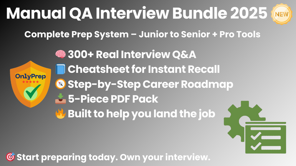 This is the complete Manual QA interview prep system. Five carefully designed resources — created by experienced QA engineers and tech hiring mentors — based on real interview formats and current QA industry expectations.