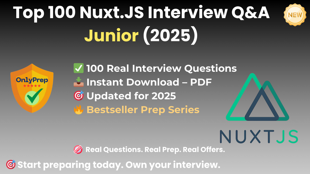 Built from real interview patterns, this pack includes the exact types of questions that junior Nuxt.js candidates face at startups, SaaS platforms, frontend-focused teams, and modern web agencies in 2025.
