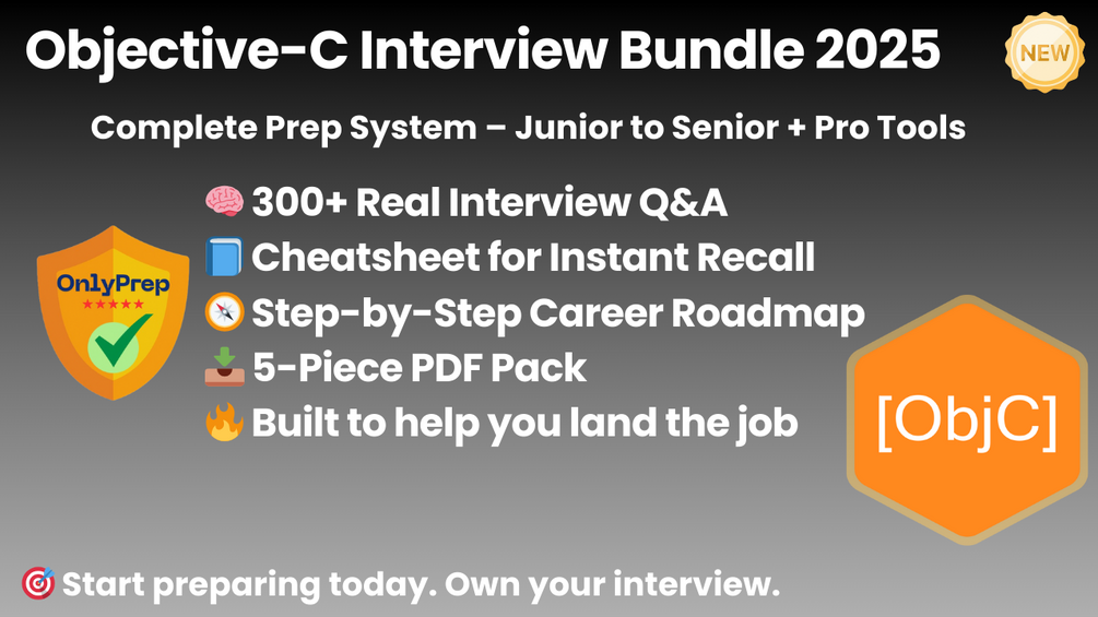 This is the complete Objective-C interview prep system. Five powerful resources — crafted by experienced iOS engineers, based on real hiring patterns, and built to help you write better code, debug faster, and land your next iOS role with confidence.