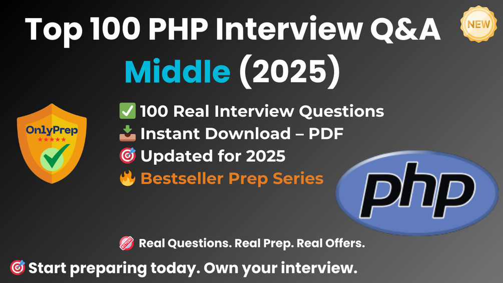 Built from real interview patterns, this pack includes the exact types of questions that middle PHP candidates face at startups, agencies, and tech companies in 2025.