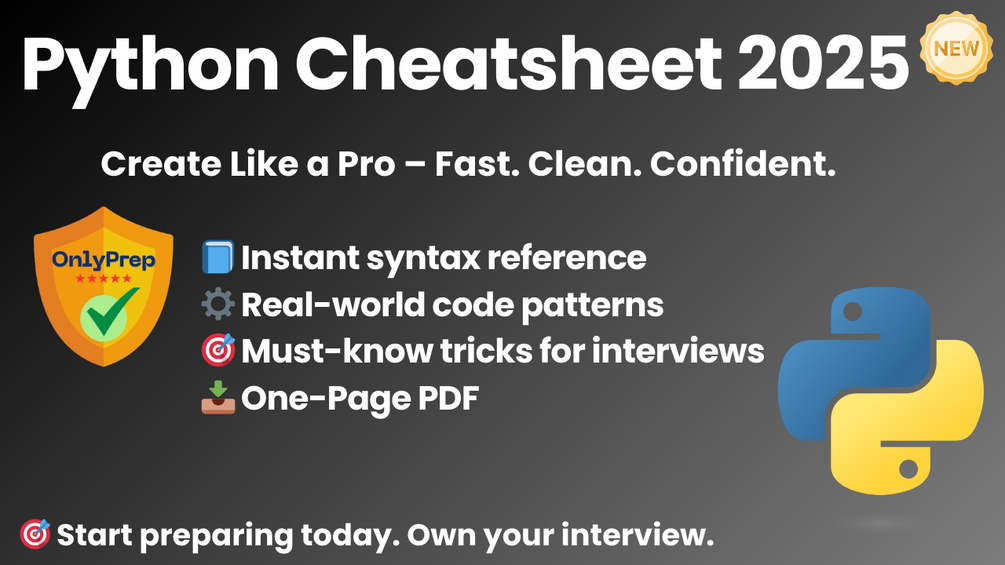 This cheatsheet is your go-to quick reference for core Python syntax, essential patterns, and interview-ready tips. Whether you’re prepping for a technical screen, building your next backend project, or leveling up for a new role — this sheet is built to save time and sharpen your edge.
