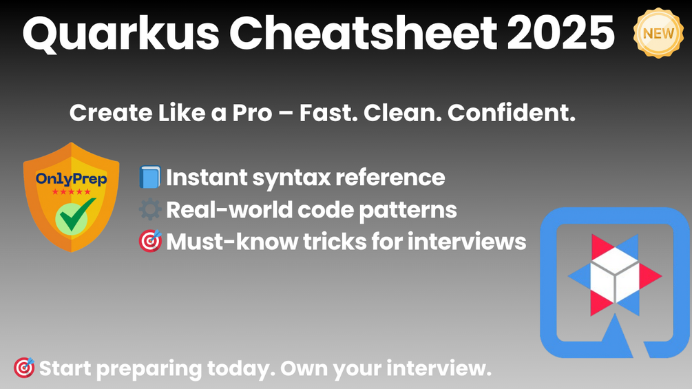 This cheatsheet is your go-to reference for Quarkus development. It covers essential Java syntax, backend patterns, and tools used in modern cloud-native applications. Whether you're preparing for a backend role, working on APIs, or deploying microservices — this guide helps you stay focused and save time.