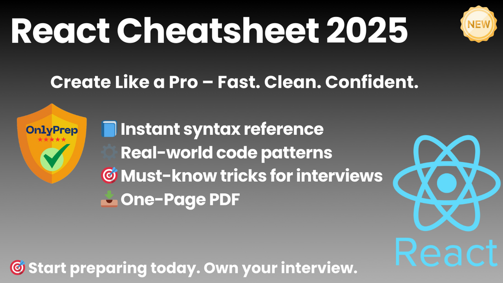 This cheatsheet is your go-to quick reference for core React syntax, modern patterns, and interview-ready tips. Whether you’re prepping for a technical screen, building your next project, or leveling up for a new role — this sheet is built to save time and sharpen your edge.