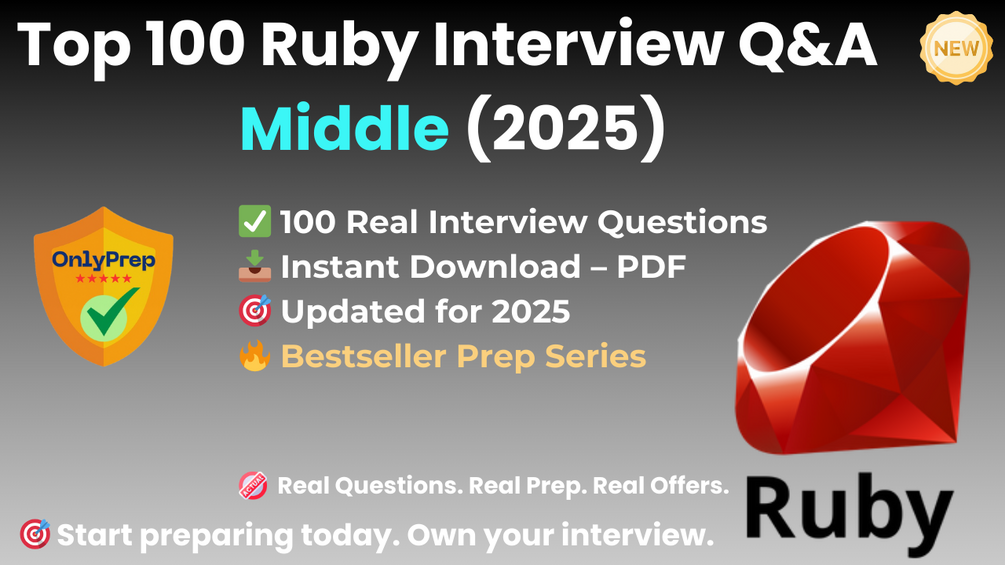 Built from real interview patterns, this pack includes the exact types of questions that mid-level Ruby candidates face at startups, agencies, and tech companies in 2025.