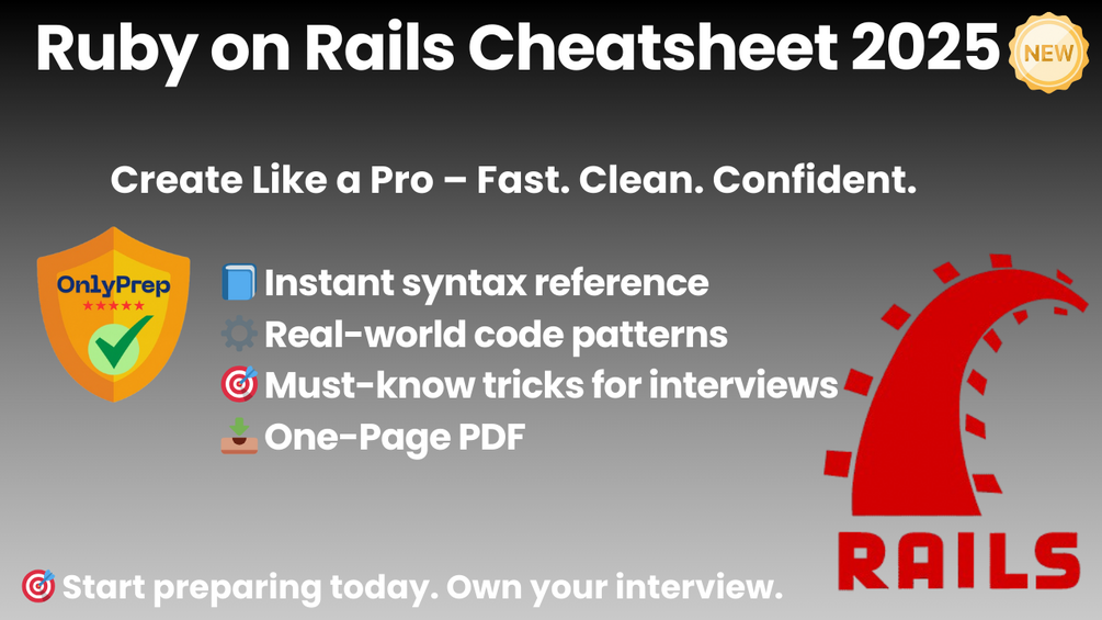 This cheatsheet is your go-to quick reference for Ruby on Rails development, covering controller logic, ActiveRecord patterns, modular architecture, and real interview tips. Whether you’re prepping for a backend tech screen, building production apps, or leveling up your Rails workflow — this sheet is built to save time and boost your confidence.