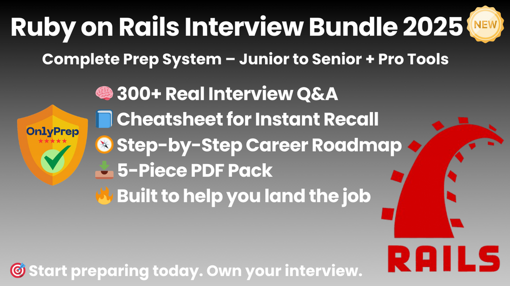 This is the complete Ruby on Rails interview prep system. Five powerful resources — crafted by experienced Rails developers, based on real hiring patterns, and built to help you write cleaner code, debug faster, and land your next Rails role with confidence.