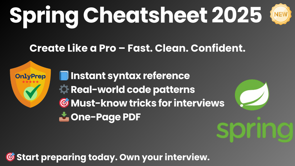 This cheatsheet is your go-to quick reference for Spring development, covering controller logic, JPA patterns, modular architecture, and real interview tips. Whether you’re prepping for a backend tech screen, building production apps, or leveling up your Spring workflow — this sheet is built to save time and boost your confidence.