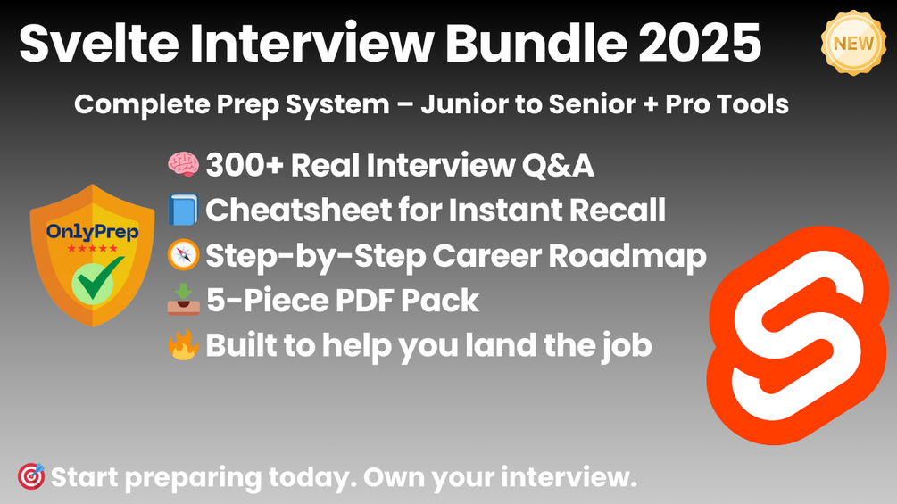 This is the complete Svelte interview prep system. Five carefully crafted resources — created by experienced front-end developers and hiring mentors — based on real interview formats and modern front-end expectations. Built to help you review core Svelte concepts, practice real questions, and walk into your next interview with confidence.