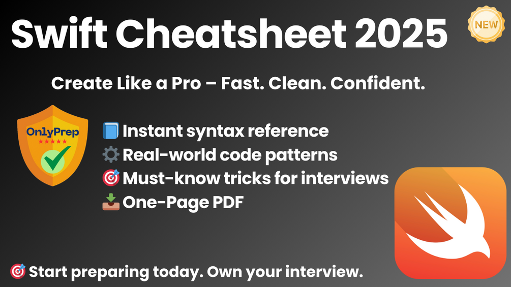 This cheatsheet is your go-to quick reference for core Swift syntax, modern patterns, and interview-ready tips. Whether you’re reviewing before an interview, shipping your own app, or prepping for a technical screen — this is built to save time and sharpen your edge.