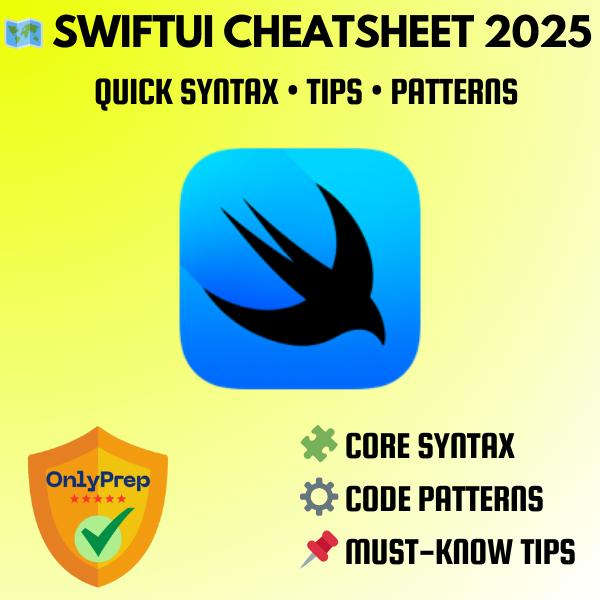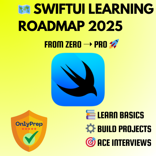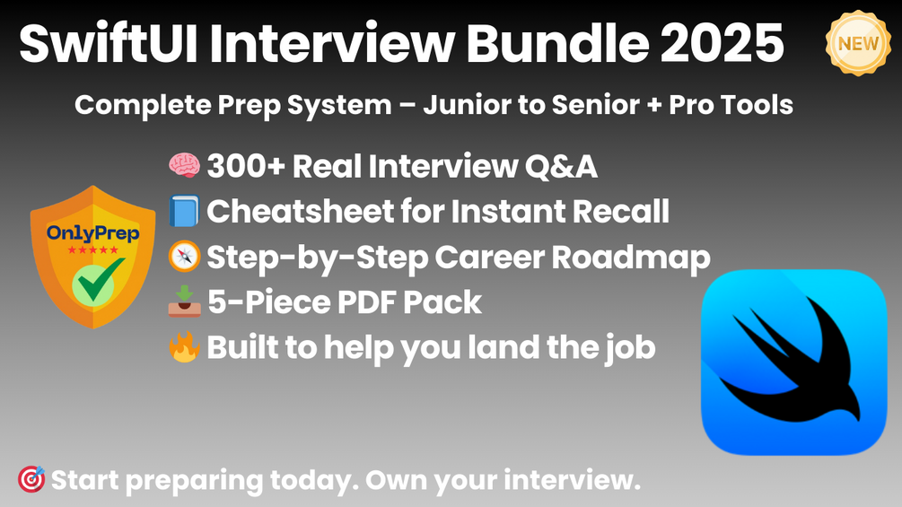 This is the complete SwiftUI interview prep system. Five powerful resources — crafted by experienced iOS developers, tech leads, and app creators, based on real hiring patterns in mobile development, startups, and enterprise iOS teams. Built to help you write clean Swift code, solve UI challenges, and land your next SwiftUI-focused role with confidence.