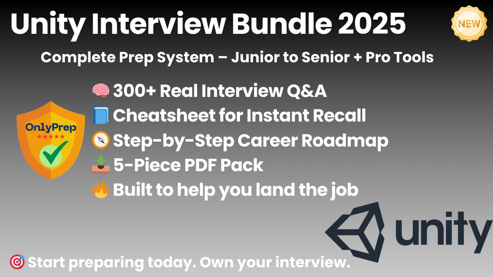 This is the complete Unity interview prep system. Five well-organized resources — created by experienced game developers and technical mentors — based on real interview questions and game studio hiring trends. Built to help you practice, review, and feel ready for your next opportunity in game development.
