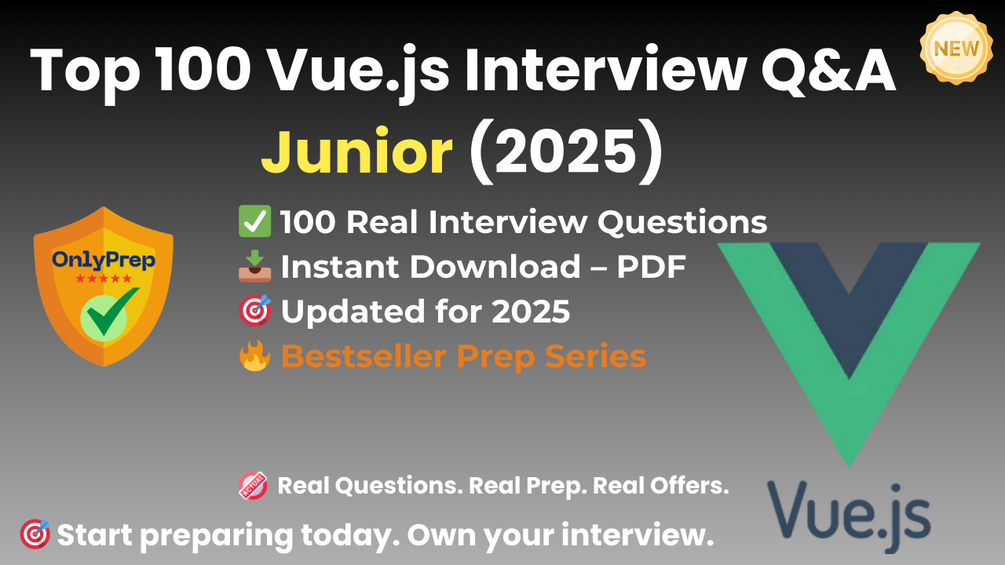 Built from real interview patterns, this pack includes the exact types of questions that junior Vue.js candidates face at startups, agencies, and tech companies in 2025.